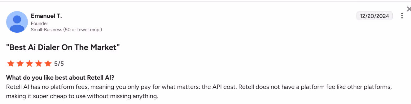 Retell AI is known for its quick, live chat onboarding and fast, reliable service to help teams launch smoothly.