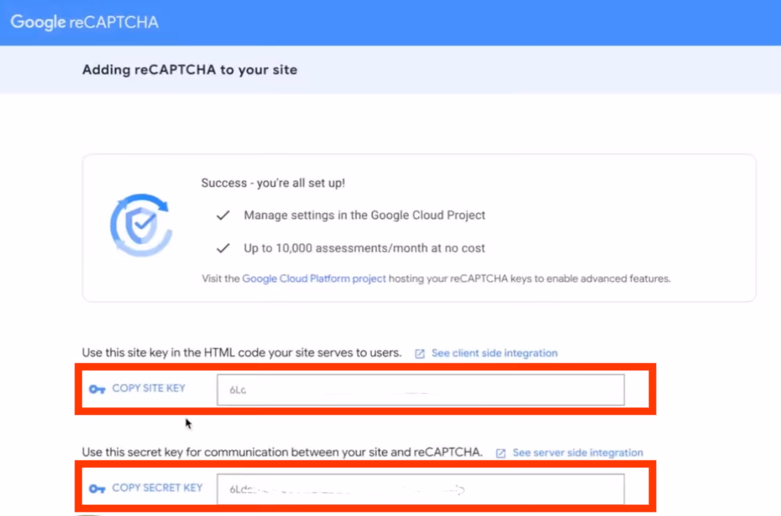 Important: Copy both the Site Key and Secret Key, you'll need these shortly