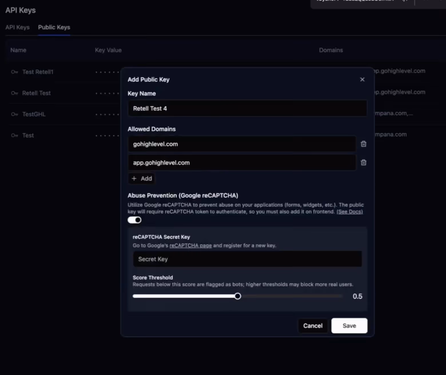 4. Insert your Public Key (from Retell AI)